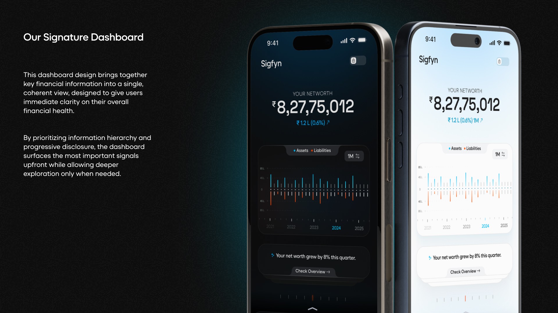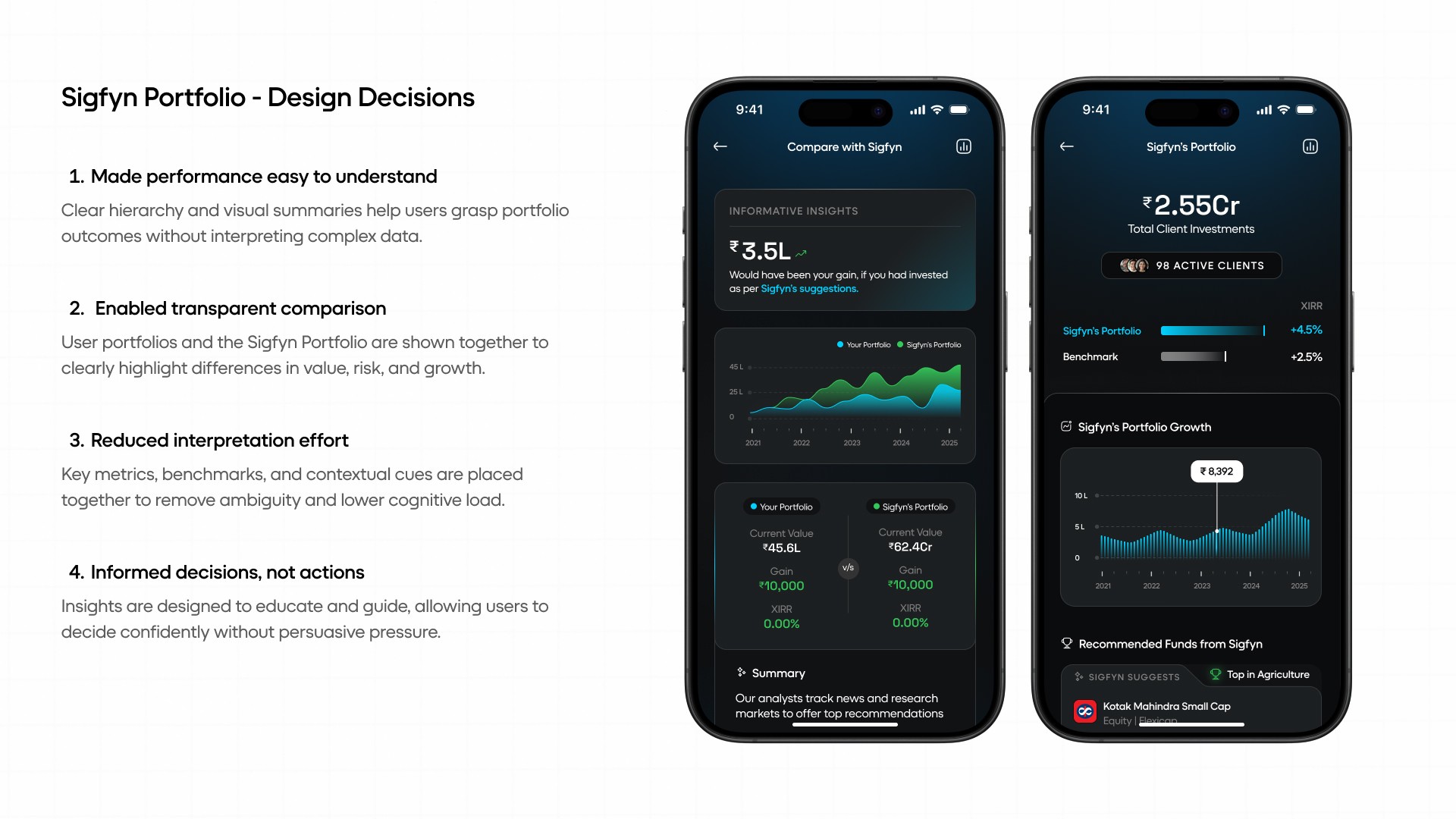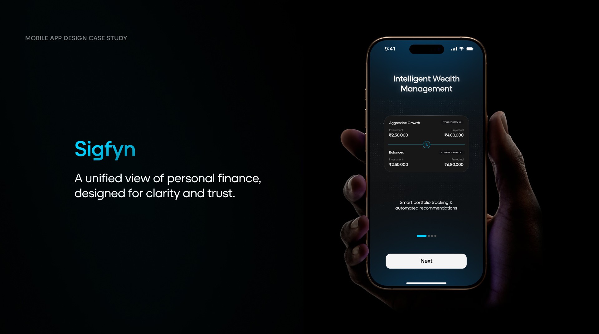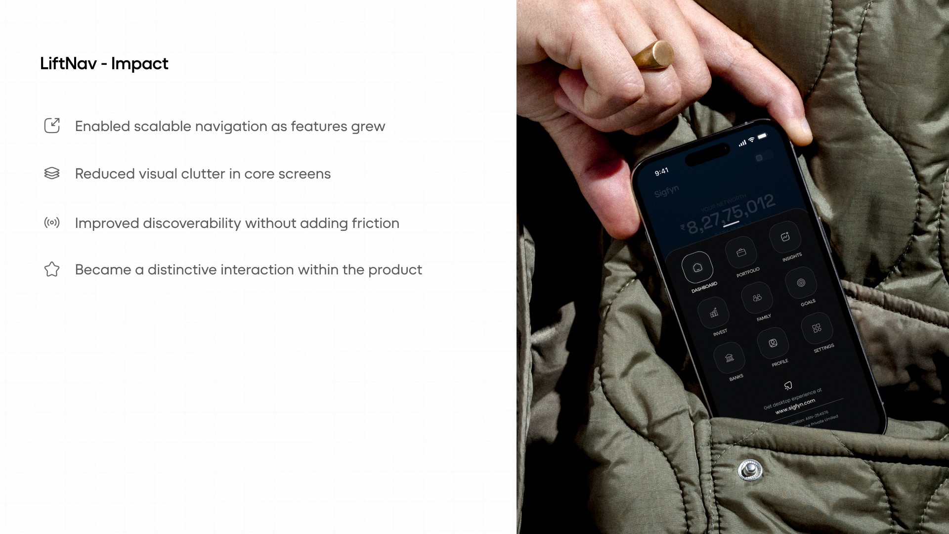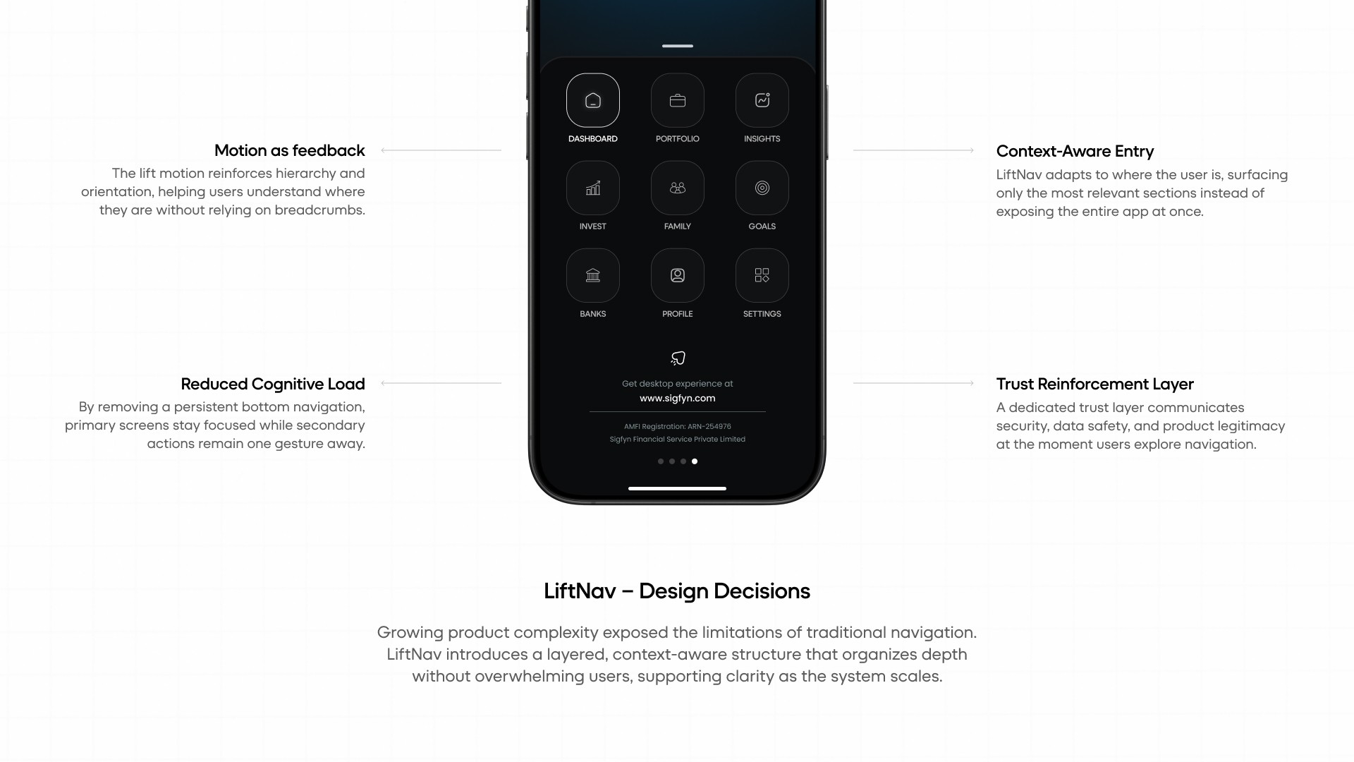 Introduction: Sigfyn is a fintech mobile app designed to provide users with a unified, real-time view of their finances, including banking, investments, liabilities, goals, and credit cards. Challenge: The primary challenge was designing for high cognitive load and trust-sensitive financial data, while ensuring the product could scale across multiple financial use cases and user mental models. Solution: The product experience was structured around progressive disclosure, adaptive navigation, and systemized information hierarchy, allowing users to access depth without feeling overwhelmed. Design decisions prioritized clarity, predictability, and long-term scalability. UX Methodologies Used: • Mental model mapping • Progressive disclosure frameworks • Systems-oriented information architecture • Interaction pattern abstraction • Design system governance Methodology Notes: This case study highlights outcomes; methodology details are available on request. Contact for detailed Case Study Showcase.