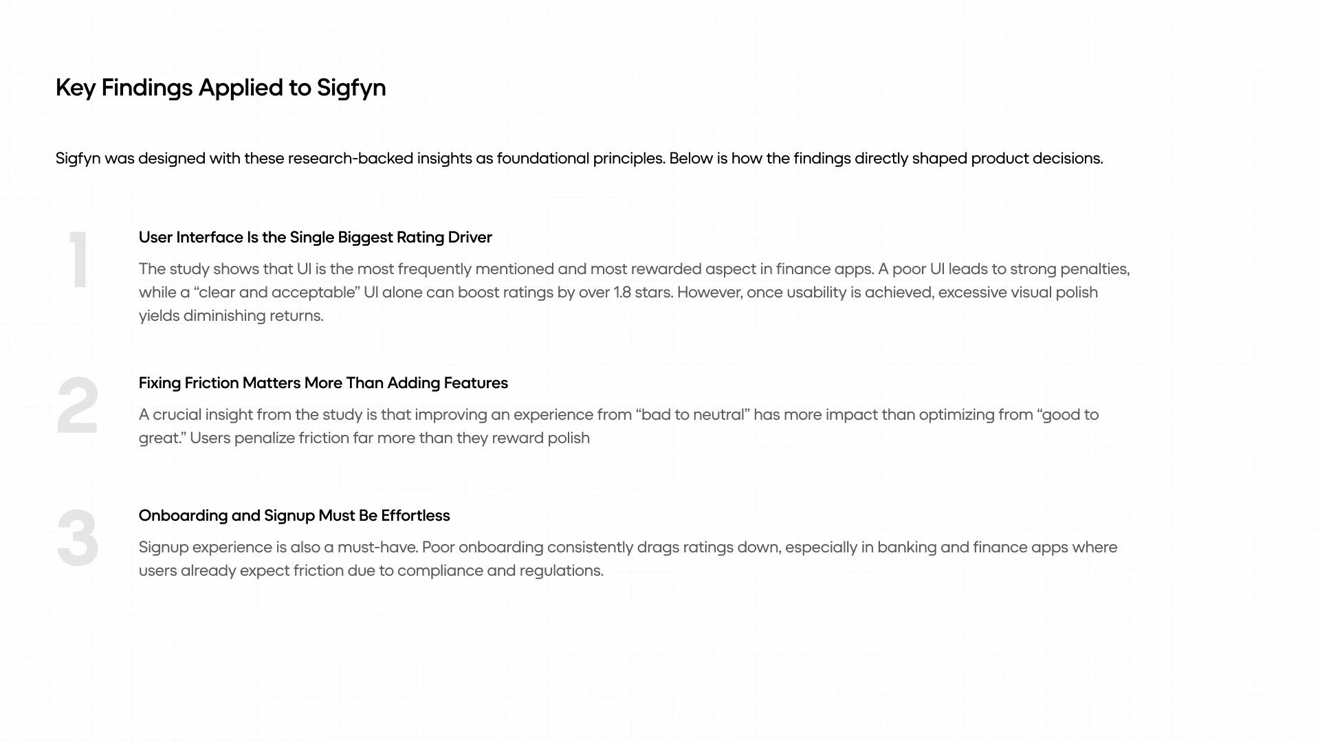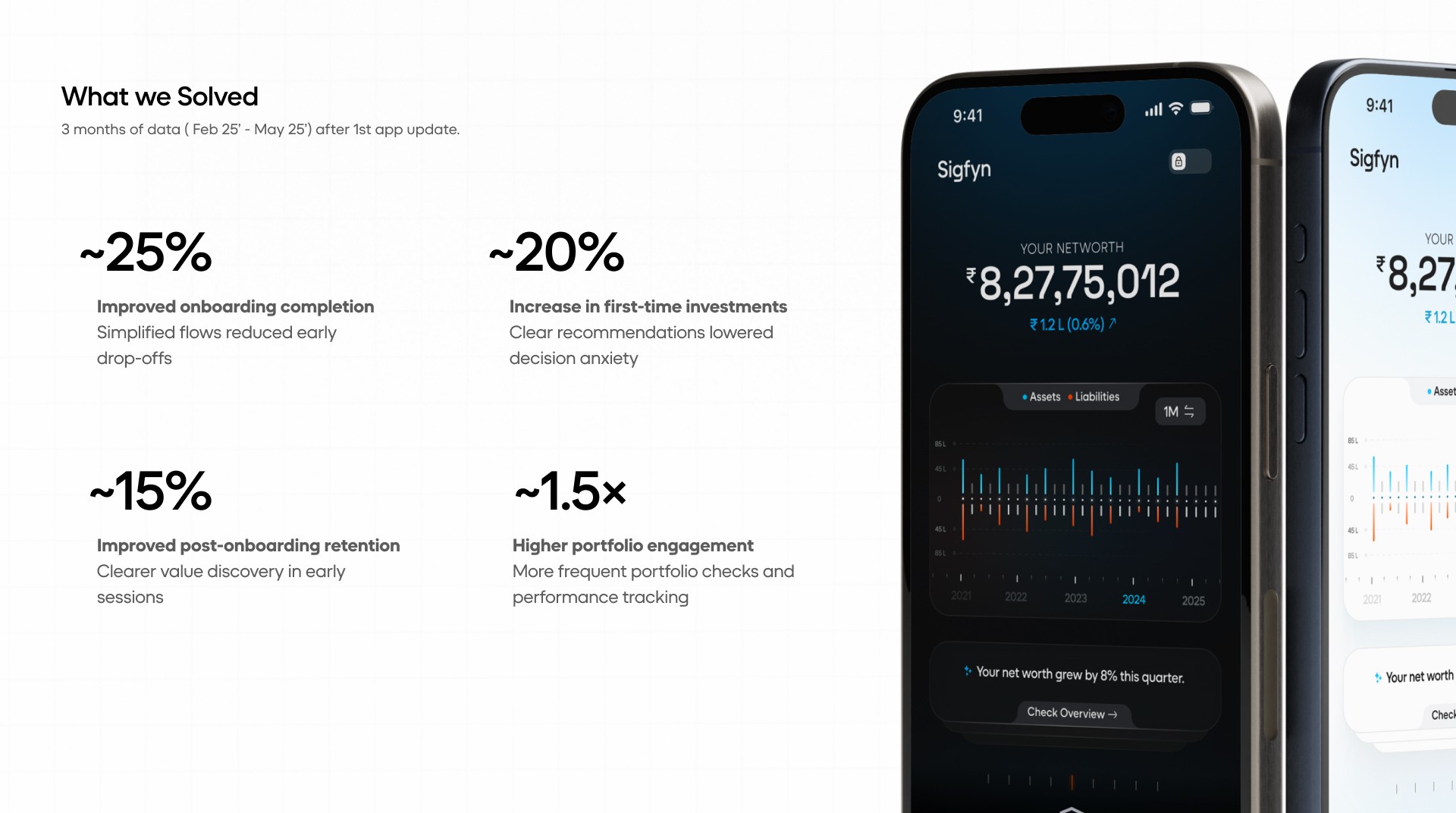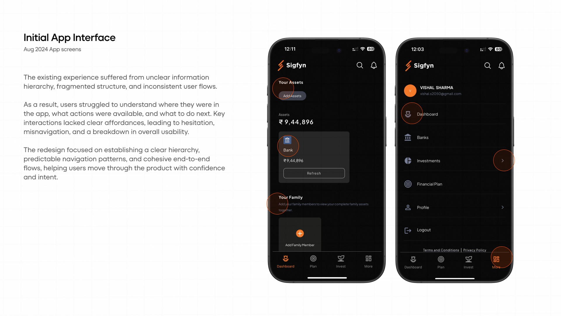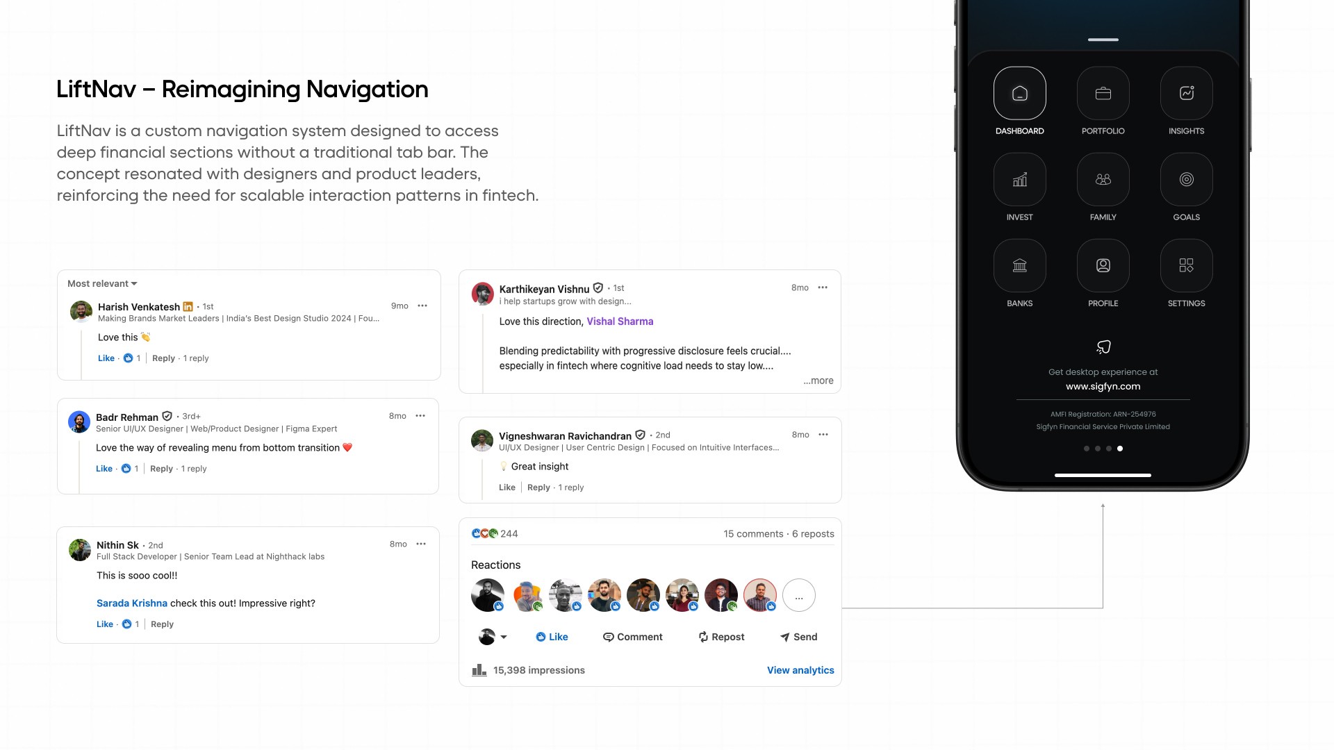 Introduction: Sigfyn is a fintech mobile app designed to provide users with a unified, real-time view of their finances, including banking, investments, liabilities, goals, and credit cards. Challenge: The primary challenge was designing for high cognitive load and trust-sensitive financial data, while ensuring the product could scale across multiple financial use cases and user mental models. Solution: The product experience was structured around progressive disclosure, adaptive navigation, and systemized information hierarchy, allowing users to access depth without feeling overwhelmed. Design decisions prioritized clarity, predictability, and long-term scalability. UX Methodologies Used: • Mental model mapping • Progressive disclosure frameworks • Systems-oriented information architecture • Interaction pattern abstraction • Design system governance Methodology Notes: This case study highlights outcomes; methodology details are available on request. Contact for detailed Case Study Showcase.