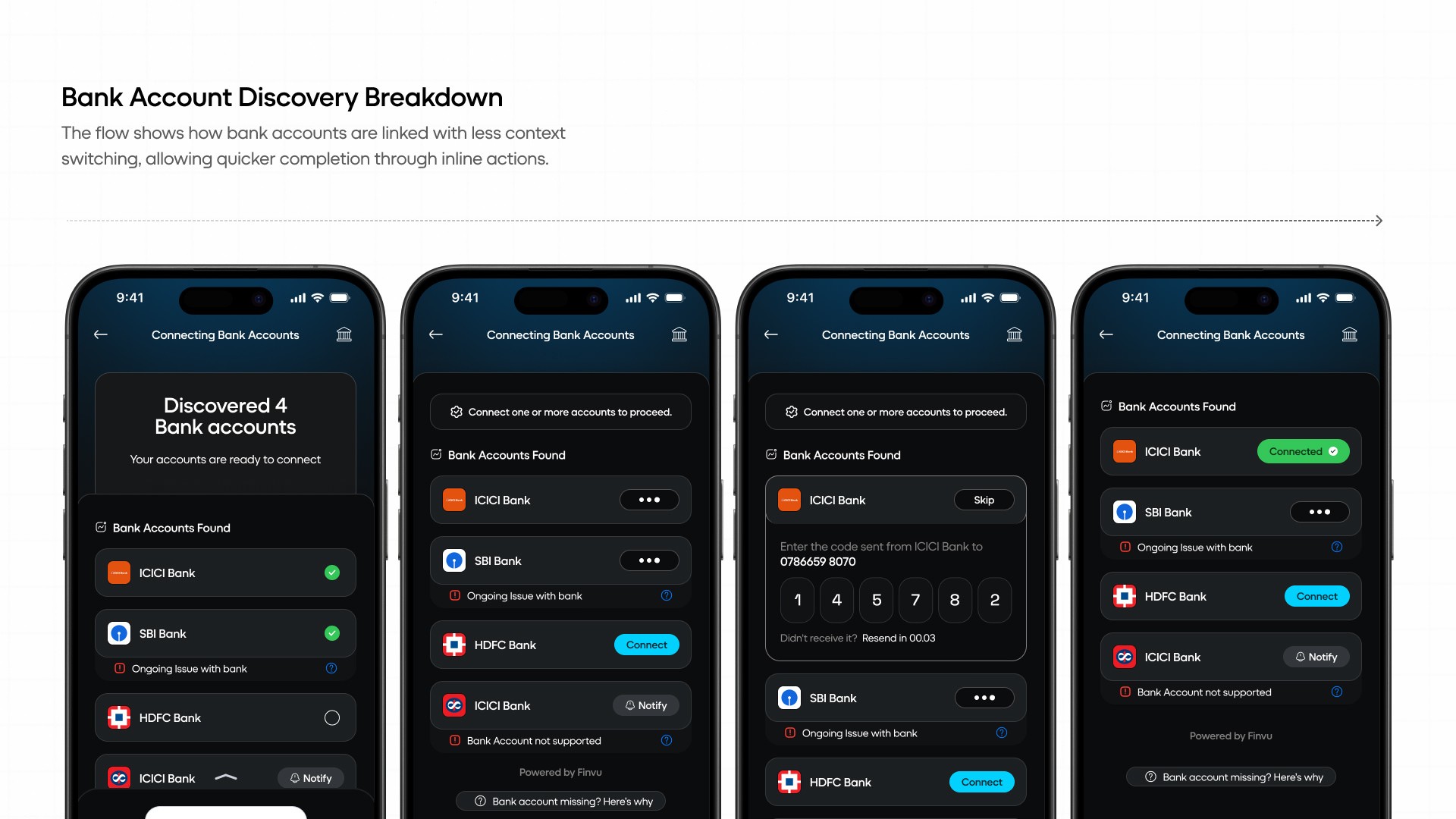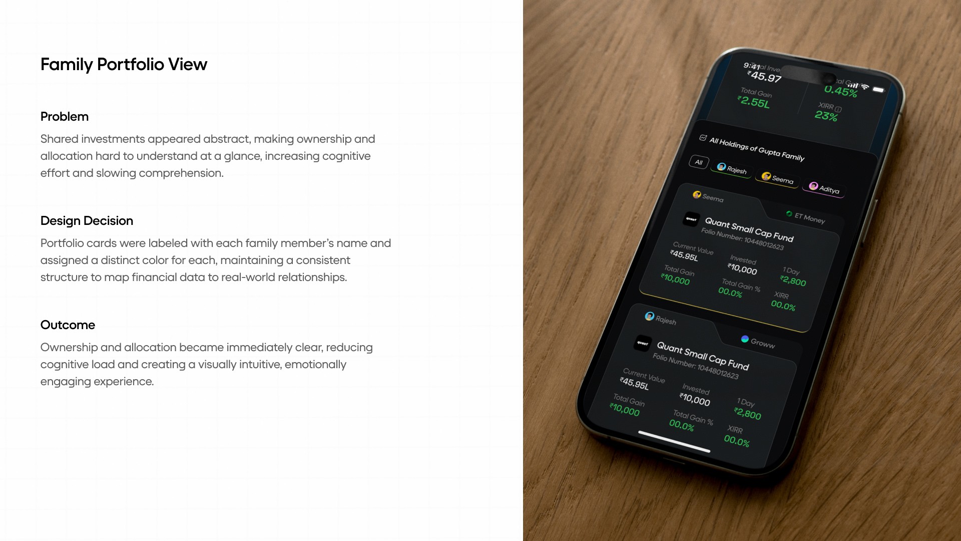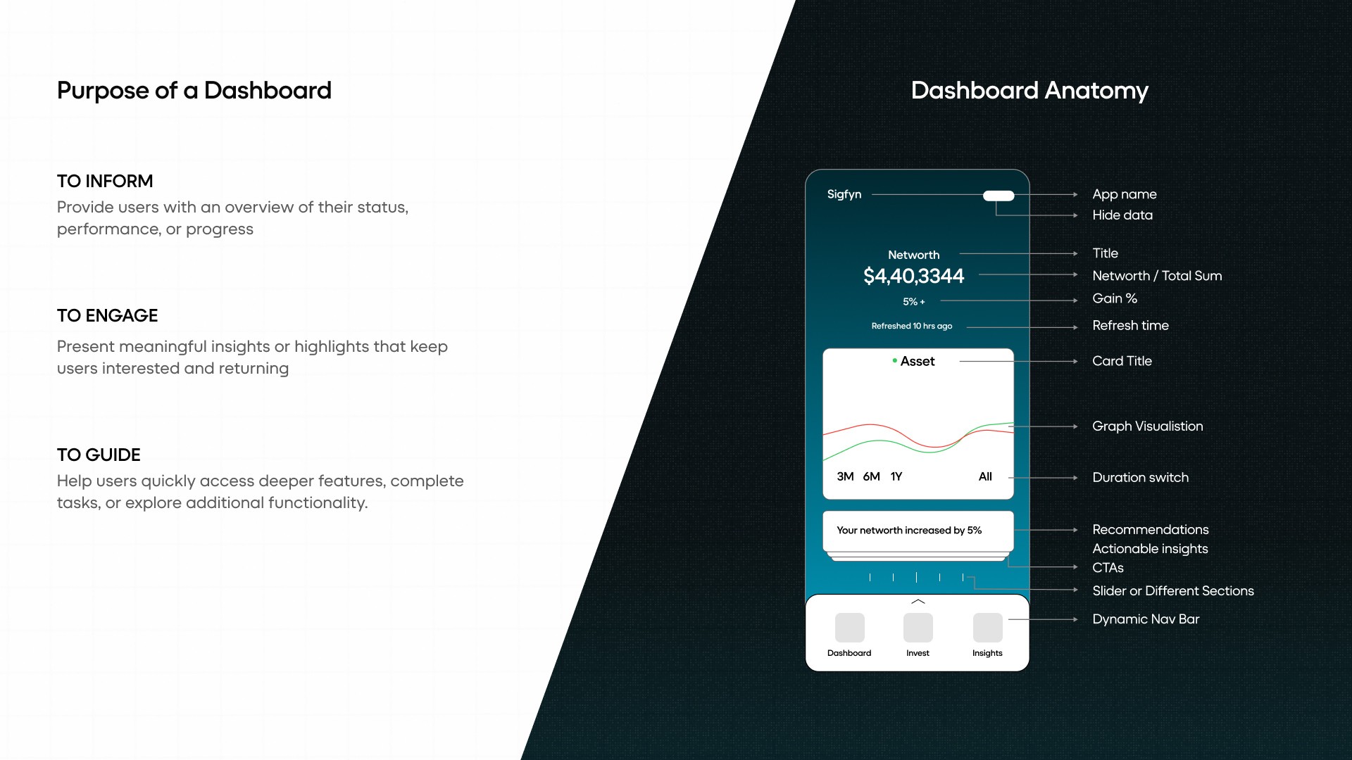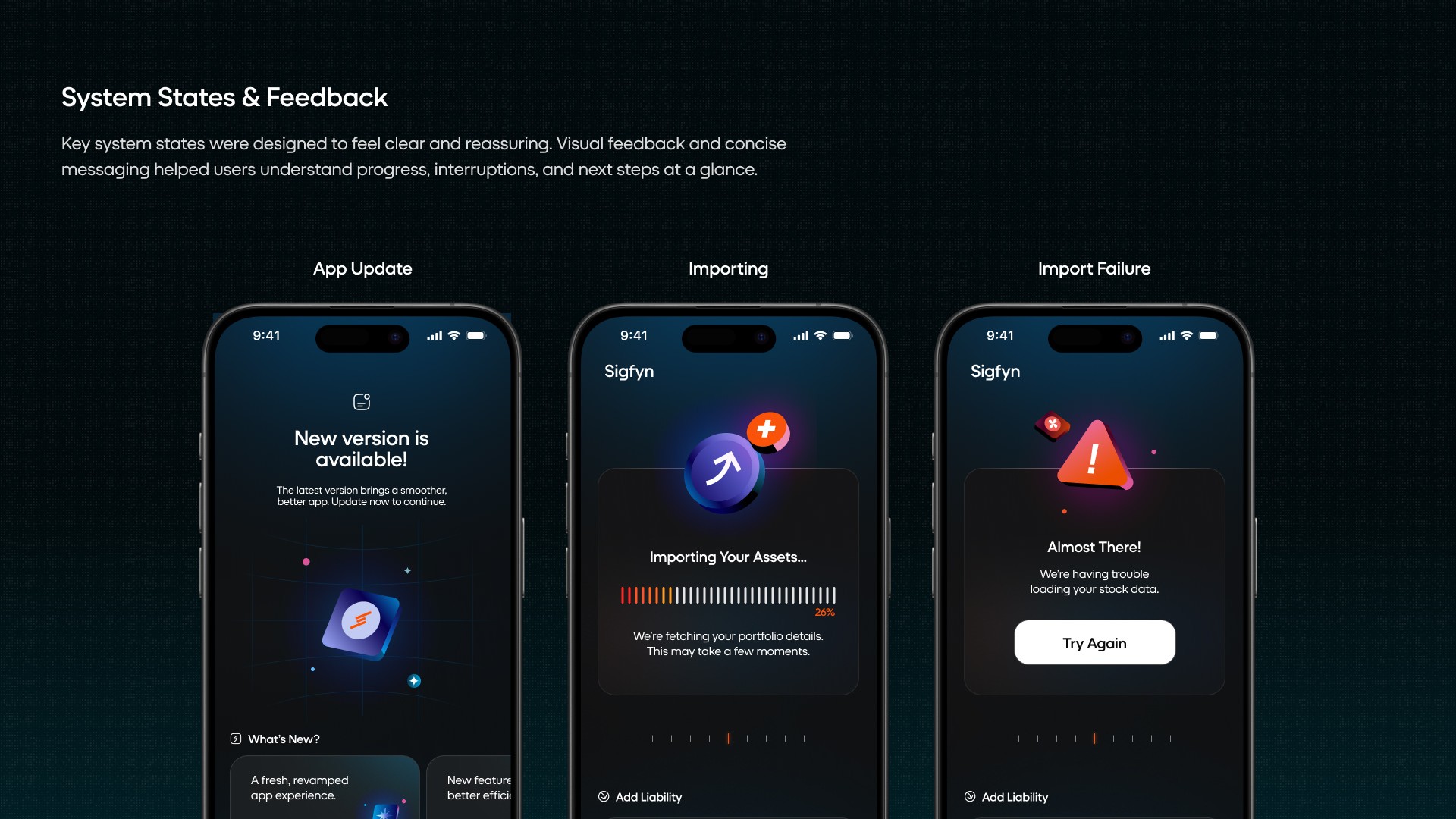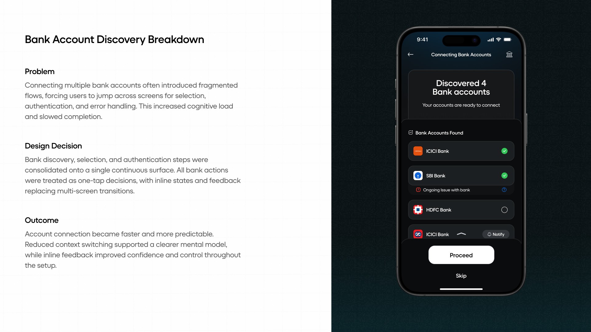 Introduction: Sigfyn is a fintech mobile app designed to provide users with a unified, real-time view of their finances, including banking, investments, liabilities, goals, and credit cards. Challenge: The primary challenge was designing for high cognitive load and trust-sensitive financial data, while ensuring the product could scale across multiple financial use cases and user mental models. Solution: The product experience was structured around progressive disclosure, adaptive navigation, and systemized information hierarchy, allowing users to access depth without feeling overwhelmed. Design decisions prioritized clarity, predictability, and long-term scalability. UX Methodologies Used: • Mental model mapping • Progressive disclosure frameworks • Systems-oriented information architecture • Interaction pattern abstraction • Design system governance Methodology Notes: This case study highlights outcomes; methodology details are available on request. Contact for detailed Case Study Showcase.